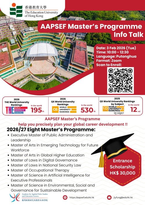 You are cordially invited to our upcoming information talk on the Master’s programmes offered by the Academy for Applied Policy Studies and Education Futures (AAPSEF), where we will share key details and explore pathways for your academic and professional growth. For the 2026/27 academic year, we are pleased to introduce a new scholarship programme: outstanding local and non-local students will have a chance to apply for an entrance scholarship of HK$30,000.
