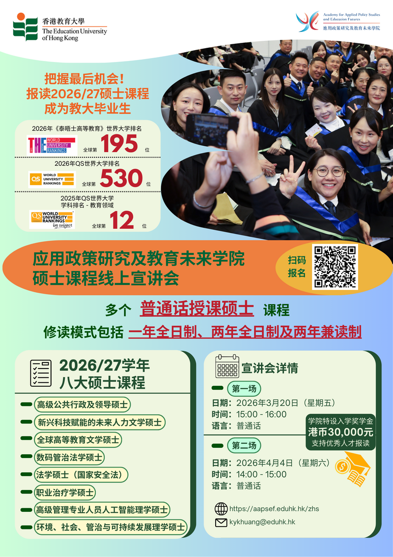 應用政策研究及教育未來學院(AAPSEF)提供8個前瞻性碩士課程,涵蓋公共行政及領導、新興科技、全球高等教育、數碼管治、國家安全法、人工智慧、職業治療及ESG可持續發展等多個領域。熱門專業全方位解析,助你把握職業發展的未來路向。