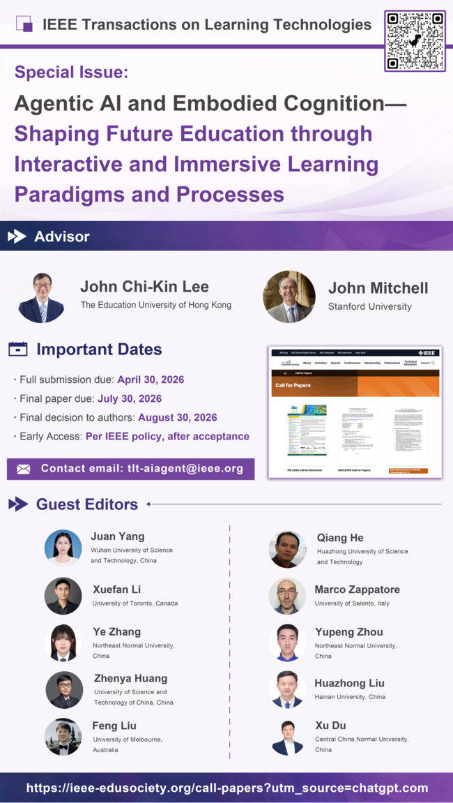 IEEE Transactions on Learning Technologies (IEEE-TLT), JCR Q1 and also a flagship journal of the IEEE Education Society, just announced a timely special issue focused on the convergence of Agentic AI and Embodied Cognition in educational contexts. This special issue invites evidence-based research and theory that advances understanding of how agentic AI and embodied cognition can be designed, studied, and evaluated in learning and teaching contexts. Contributions that connect technical innovation to learning sciences, rigorous evaluation, and practical implications for educational technology are welcomed.